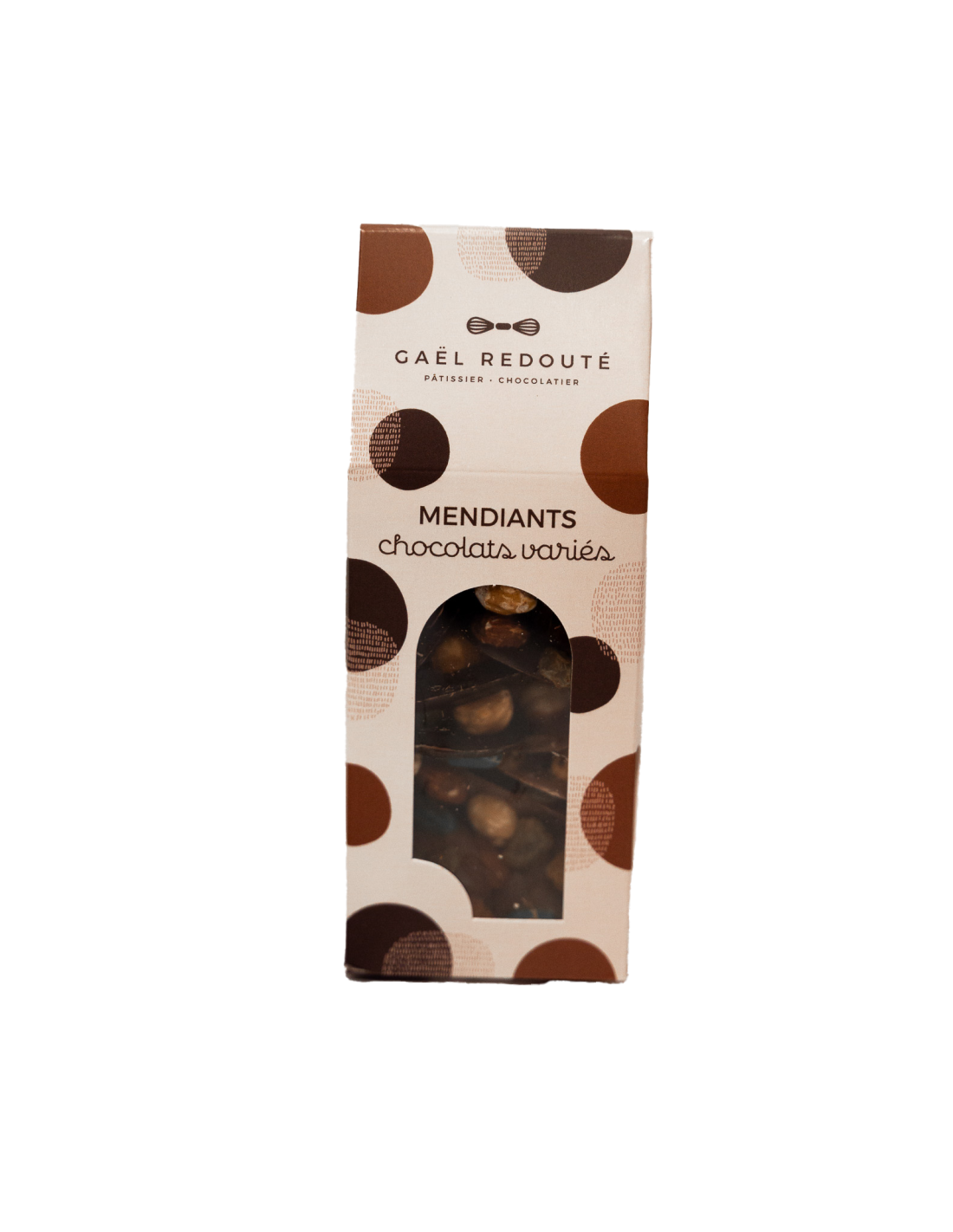 Ingrédients: chocolat noir (fève de cacao, sucre, beurre de cacao, émulsifiant: lécithine de tournesol, extrait naturel de vanille) ou chocolat au lait (beurre de cacao, lait entier en poudre, sucre, fève de cacao, émulsifiant: lécithine de tournesol, extrait naturel de vanille), amande, pistache, raisin sec, abricot sec, ananas sec. Pour 100 g.: 525 kcal, 36g. matière grasse, dont 14g. acides gras saturés, 38g. glucides, dont 34g. sucres, 11g. protéines, 0,07g. sel